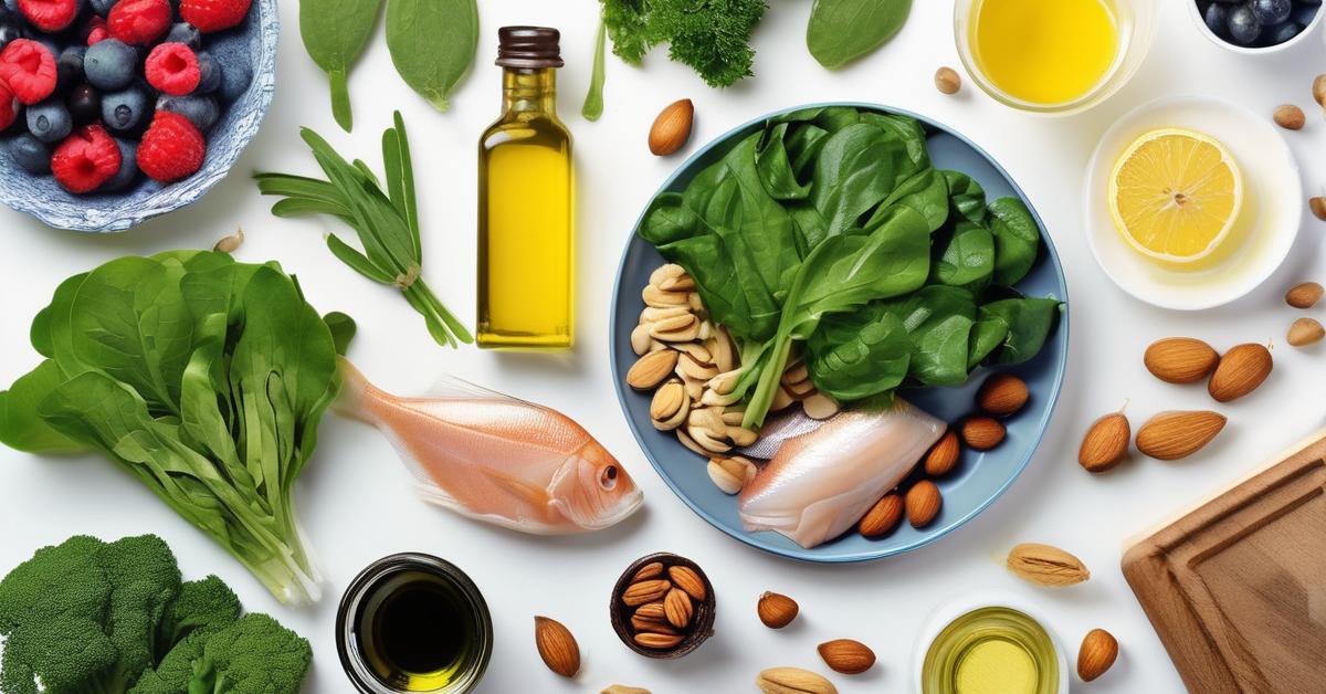 Świeże i zdrowe składniki diety MIND: warzywa liściaste, jagody, orzechy, oliwa z oliwek i ryby dla zdrowia mózgu.