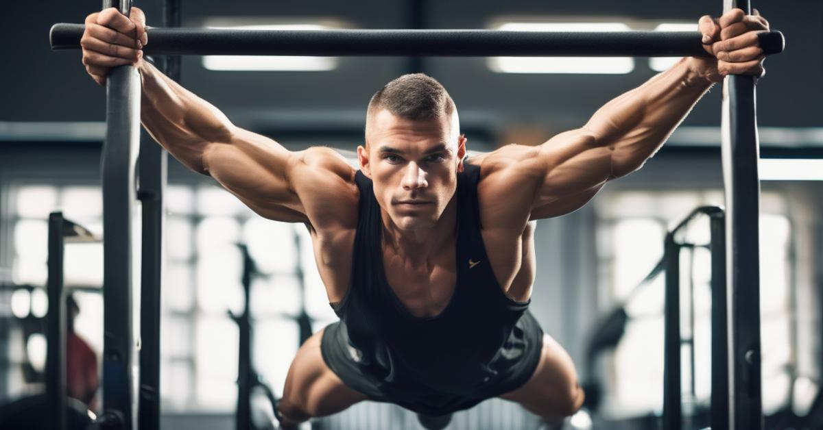 Silny mężczyzna wykonuje dipy na poręczach, demonstrując siłę i sprawność fizyczną.